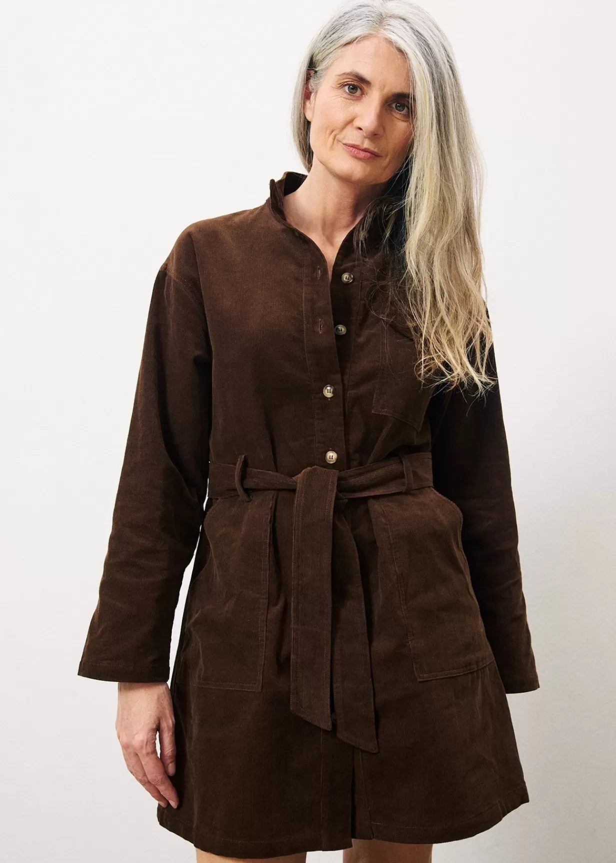 • Robe en velours côtelé fin• Poches plaquées• Col montant• Ceinture amovibleTaille :La mannequin porte une t…